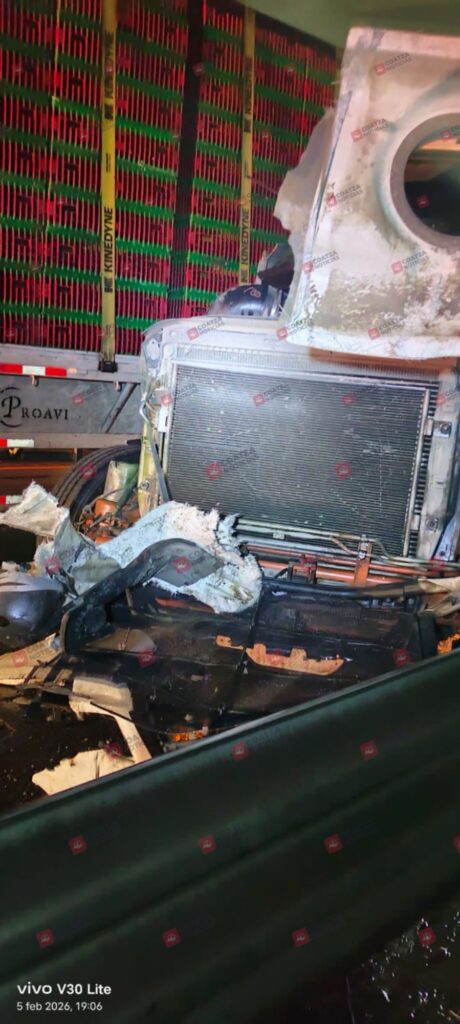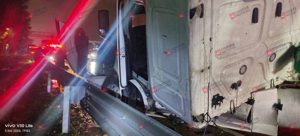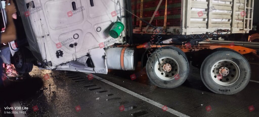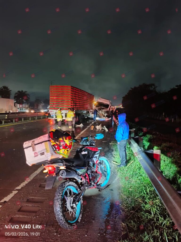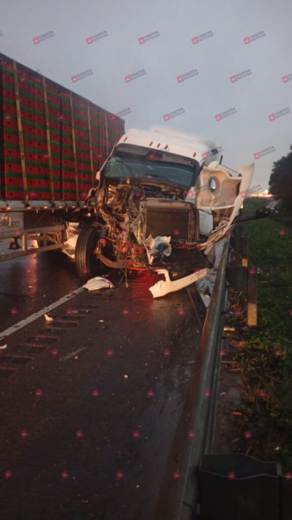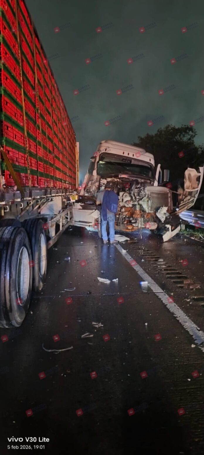 Se registró un accidente vial sobre la autopista Orizaba–Córdoba, a la altura del tramo conocido como La Quebradora, donde un tráiler con plataforma cargado con rejas de pollo se impactó contra otro tráiler, el cual se dio a la fuga tras el percance.