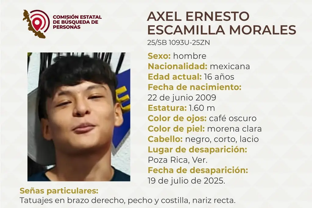 La Comisión Estatal de Búsqueda reportó la des4par1ción de un menor de 16 años de edad en Poza Rica, al norte del estado de Veracruz.