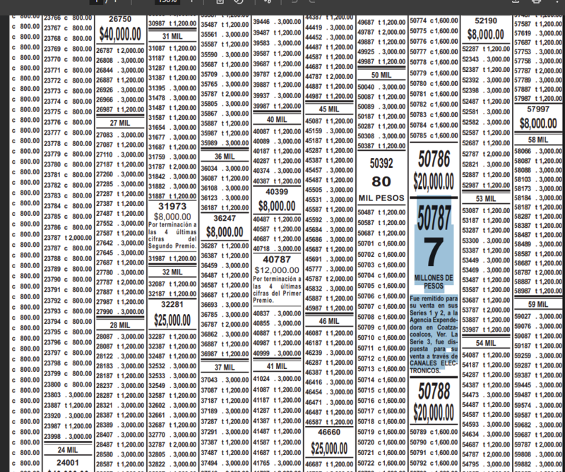 El boleto 50787 obtuvo un total de 7 millones de pesos, el cual fue remitido para su venta en sus Series 1 y 2, a la Agencia Expendedora en Coatzacoalcos.