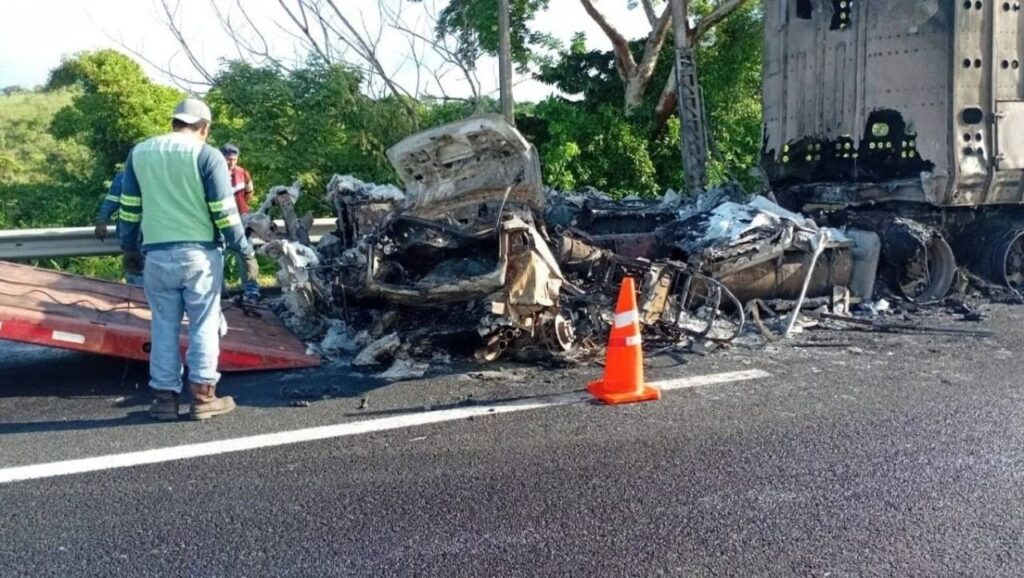 Agua Dulce, Ver. – Un trágico accidente carretero se registró la madrugada de este sábado sobre la carretera federal 180, a la altura del kilómetro 31, frente al restaurante Maya, donde un tráiler con jaula ganadera embistió a un vehículo particular tipo Jetta.