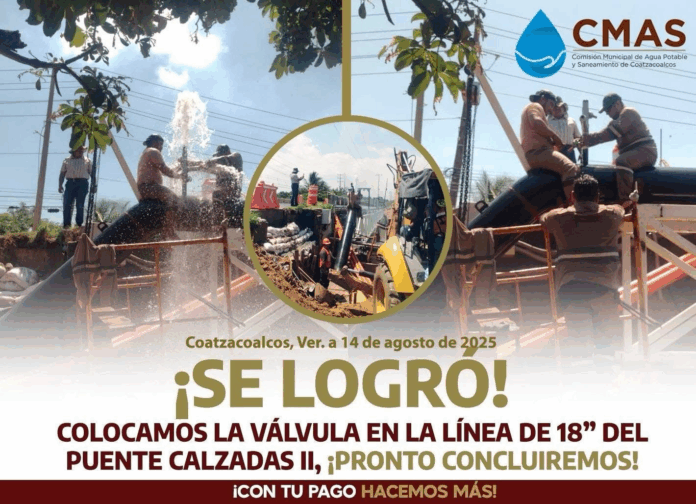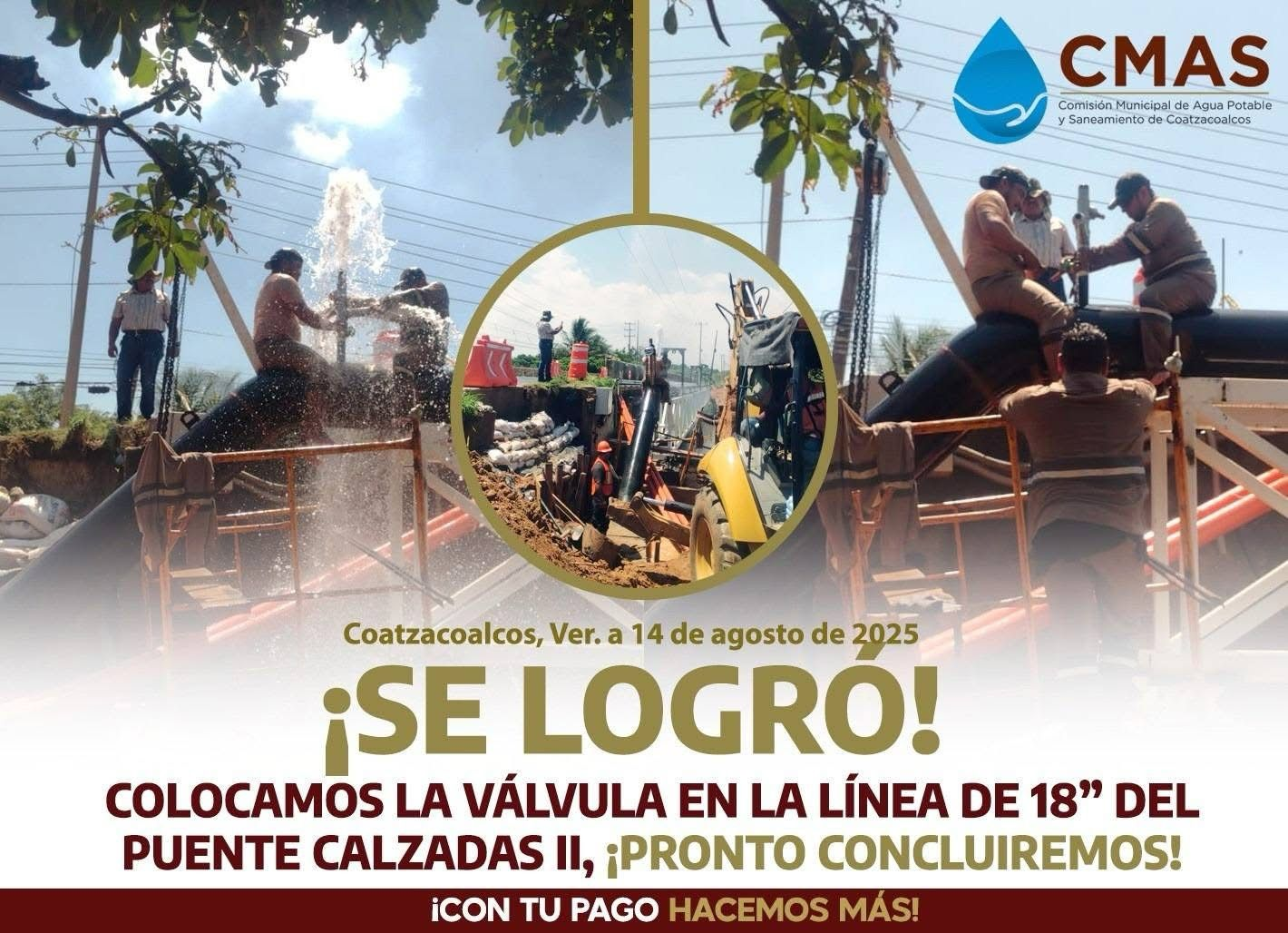De acuerdo con una publicación de CMAS Coatzacoalcos, el personal de esta dependencia ya habría colocado la tubería en la línea de 18 pulgadas del puente Calzadas II, lo que permitiría restablecer el servicio de agua en varias colonias de la ciudad.