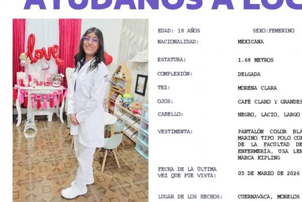 De acuerdo con la información difundida por la Fiscalía General del Estado de Morelos, la joven fue vista por última vez el jueves 5 de marzo de 2026 en Cuernavaca, en el estado de Morelos, sin que hasta el momento se conozca su paradero.