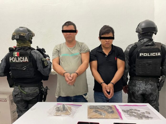 San Juan Evangelista, Ver. — Elementos de la Policía Municipal detuvieron en la comunidad de La Arena a dos hombres que portaban una granada, un arma de fuego, cartuchos, cargadores y dosis de droga listas para su venta.