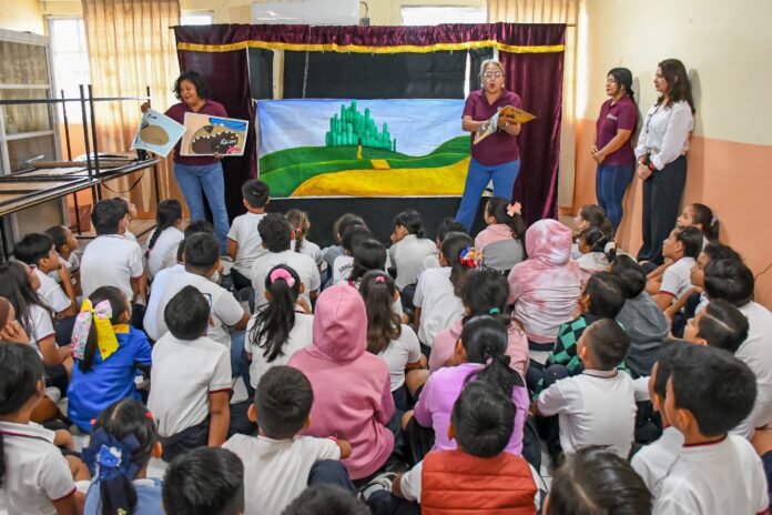 En esta ocasión, el personal de la biblioteca que se ubica en la colonia Adolfo López Mateos cargó con el gigante teatro guiñol y los títeres y los instaló en la escuela para deleitar a los niños y niñas con el cuento ‘El Mago de Oz’.