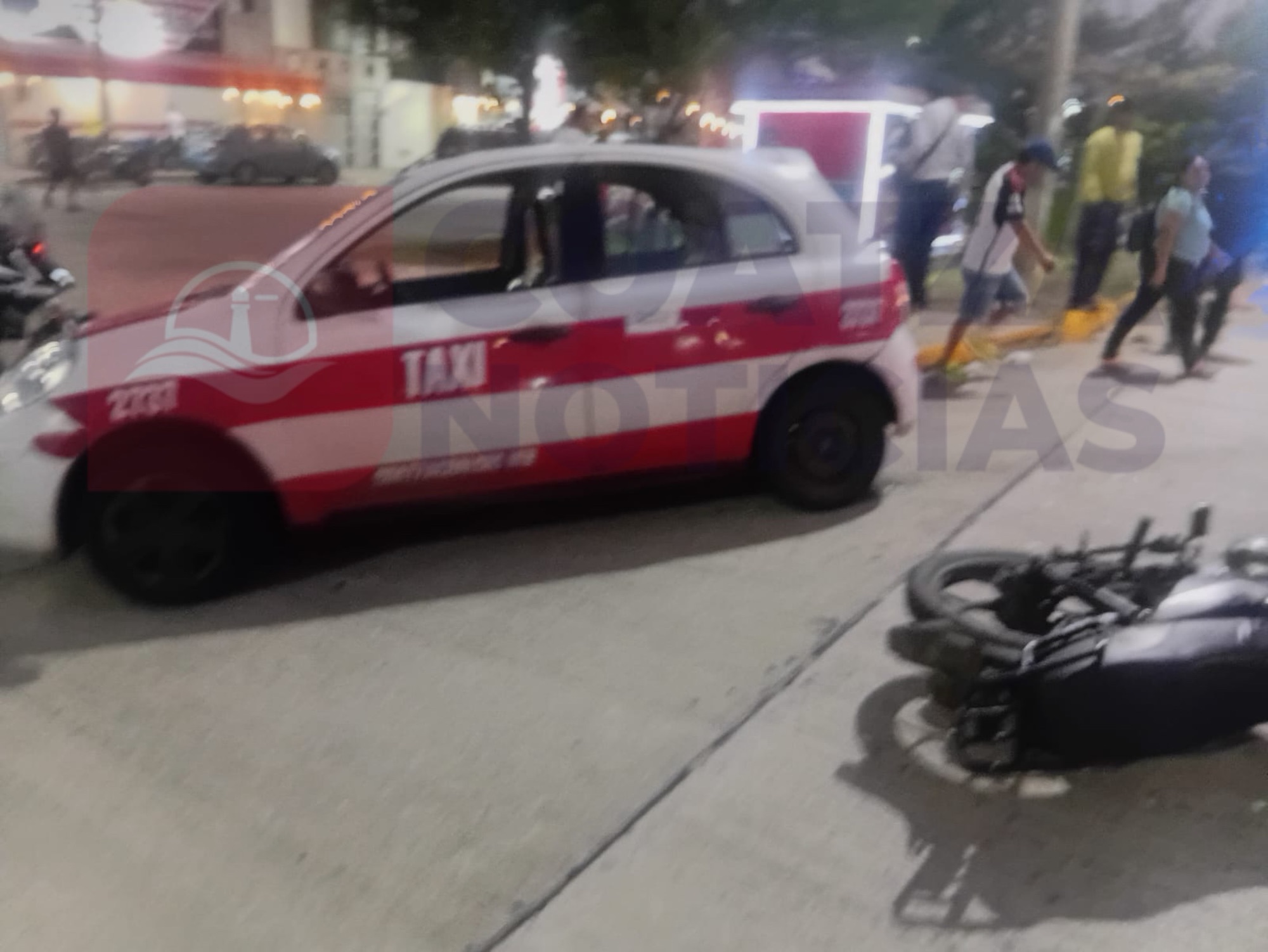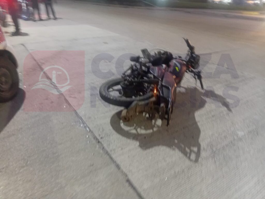 Los hechos ocurrieron en la esquina de la calle José Lemarroy González y la avenida Bahía, en el citado sector, donde colisionaron una motocicleta marca Veloci, color negro, sin placas de circulación, y un automóvil marca Nissan tipo Tsuru, habilitado como taxi, marcado con el número económico 2737, con placas A-189-XFY del Servicio de Transporte Público del estado.