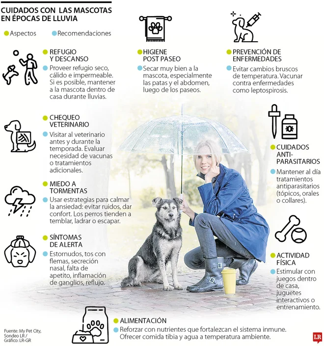 Es necesario que los tutores de las mascotas estén alertas a los síntomas que indiquen la aparición de posibles enfermedades generadas por el clima lluvioso, para una atención médica oportuna: Los principales síntomas de alerta son decaimiento, secreciones nasales, tos seca y dificultad respiratoria. También hay síntomas por exceso de humedad, como son las dermatitis, que se destacan por rascado constante, piel inflamada y caída de pelo, entre otros”, señaló Levi.