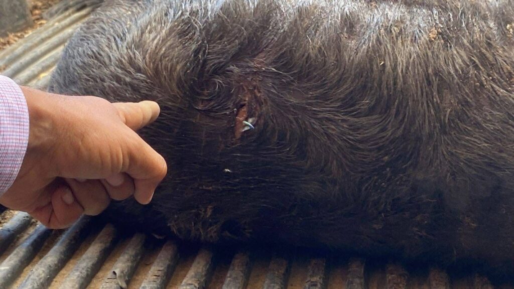 Montalvo Burgos mostró a las autoridades las huellas, marcas de colmillos y garras en el cuero del búfalo, evidencias que asegura, confirman la especie del depredador.