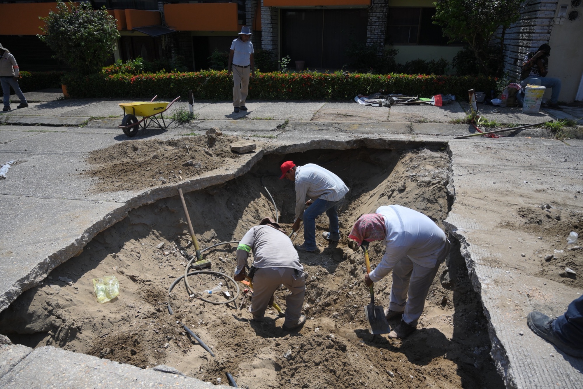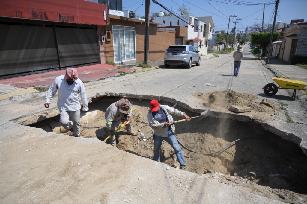 En la colonia Petrolera, cuadrillas municipales atienden afectaciones en la red de drenaje sanitario que han provocado socavones en calles como Chihuahua y Veracruz. Las labores incluyen la reparación de la infraestructura dañada para prevenir riesgos a peatones y automovilistas.