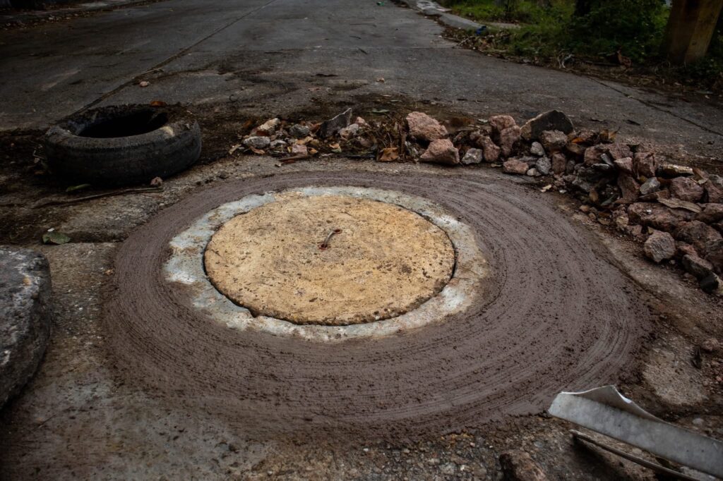 Asimismo, se realizó la colocación de una nueva tapa con brocal de concreto en un pozo de visita ubicado en la calle Nicolás Bravo, esquina Prolongación Nicolás Bravo, en la colonia Ejido Tacoteno.