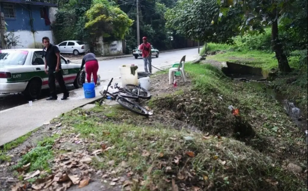 El agua brota de las faldas del Cerro de la Galaxia, en la esquina de calle Juan Rulfo y Poza Rica. Los trabajadores llenan cubetas con este líquido para limpiar unidades de transporte público, sin contar con registros oficiales del volumen usado ni tratamiento para prevenir posibles contaminaciones .