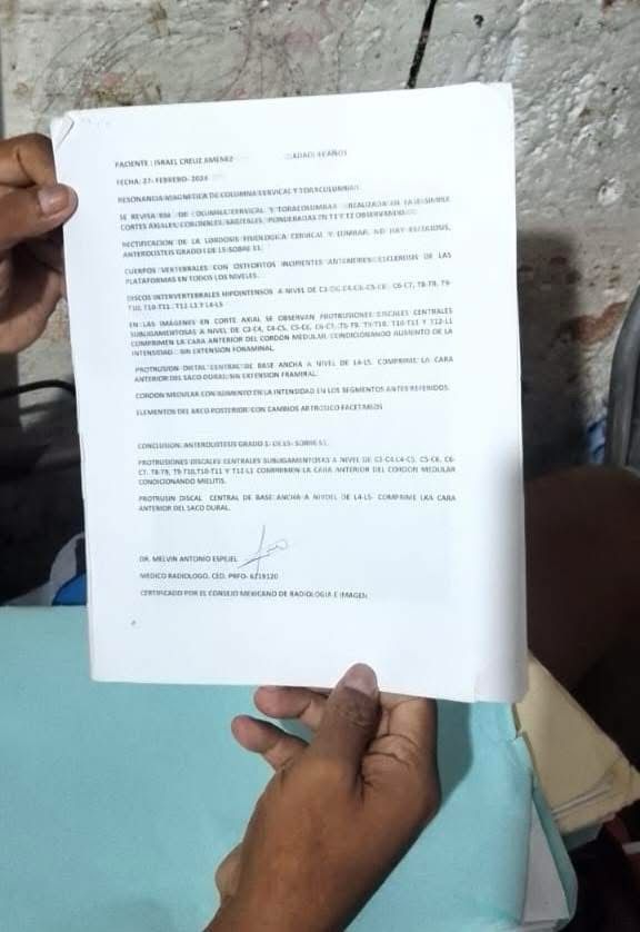 Israel, quien anteriormente se ganaba la vida con su oficio en acabados de construcción, hoy permanece postrado en una cama, sin poder caminar, con una vértebra desviada que lo mantiene inmovilizado y con dolores constantes. A pesar de haber sido valorado, sometido a resonancias magnéticas, electromiografías y análisis clínicos, su operación ha sido pospuesta una y otra vez.