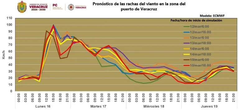 «Se establecerá un evento de Norte con rachas máximas de 95 a 115 km/h en las costas, y de 70 a 85 km/h entre Xalapa-Naolinco-Misantla y valle de Perote, decreciendo gradualmente el martes. El viento del Norte puede desarrollar oleaje de 3.0 a 5.0 metros cerca de costas, mismo que decrece el martes», dice la Alerta Gris.