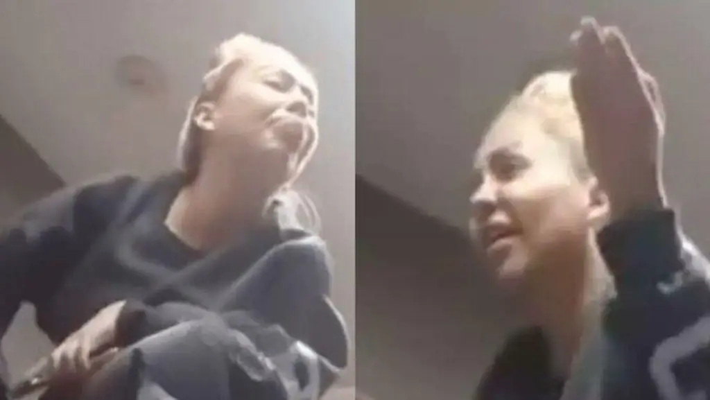La grabación muestra a la mujer que violentamente insulta a una guardia de seguridad y a un residente del edificio, presuntamente por haberle solicitado que bajara el volumen de la música en su departamento.