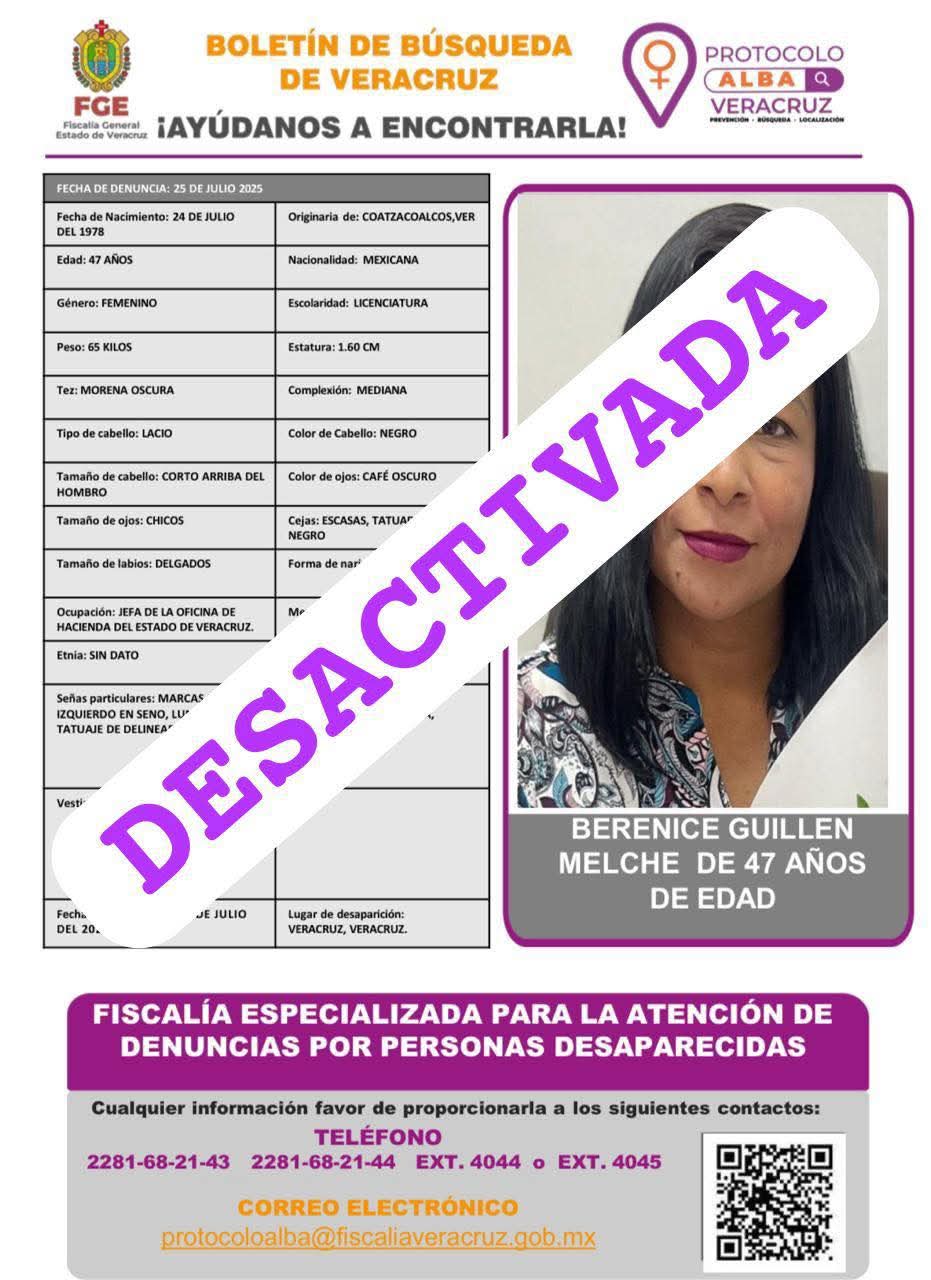 Veracruz, 27 de julio de 2025 — Durante el fin de semana, fue activada una ficha de búsqueda Alba en Veracruz por la desaparición de Berenice Guillén Melche, jefa de la Oficina de Hacienda con sede en el puerto de Veracruz y señalada como cercana a la gobernadora Rocío Nahle ().