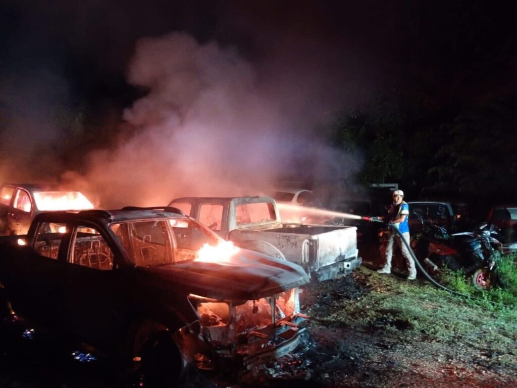 El siniestro fue reportado al 911 y rápidamente movilizó a Protección Civil y Bomberos de Acayucan, quienes lograron sofocar las llamas y realizaron maniobras de enfriamiento para evitar que el fuego se propagara a otras áreas del predio. Elementos de la Secretaría de Seguridad Pública acordonaron la zona y reforzaron la vigilancia, debido a que se trató de un incendio provocado presuntamente con bombas molotov.