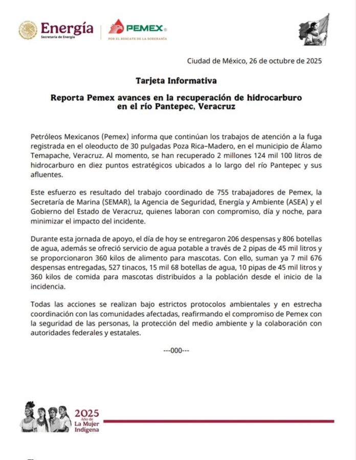 Todas las acciones se realizan bajo estrictos protocolos ambientales y en estrecha coordinación con las comunidades afectadas, reafirmando el compromiso de Pemex con la seguridad de las personas, la protección del medio ambiente y la colaboración con autoridades federales y estatales.