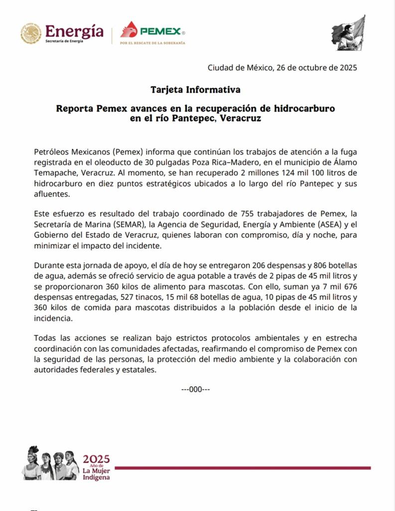 Detalló en un comunicado que continúan los trabajos de atención a la fuga registrada en el oleoducto de 30 pulgadas Poza Rica-Madero, en el municipio de Álamo Temapache, Veracruz. Al momento, se han recuperado 2 millones 124 mil 100 litros de hidrocarburo en diez puntos estratégicos ubicados a lo largo del río Pantepec y sus afluentes.