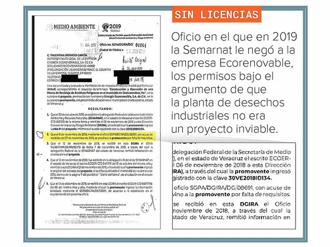 La empresa fachada, Ecorenovable, no contó con los permisos, pese a solicitarlos en 2019. La Secretaría de Medio Ambiente lo negó bajo el argumento de que era un proyecto inviable. Los estudios del Programa de Ordenamiento Ecológico de la Cuenca Baja del Río Coatzacoalcos señalaban que había un alto riesgo ecológico para este tipo de operaciones.