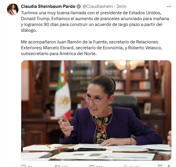 A través de su cuenta de X, la mandataria mexicana detalló que la llamada con el presidente Trump fue «muy buena» y destacó que se logró que no se aumenten los aranceles anunciados para este 1 de agosto.