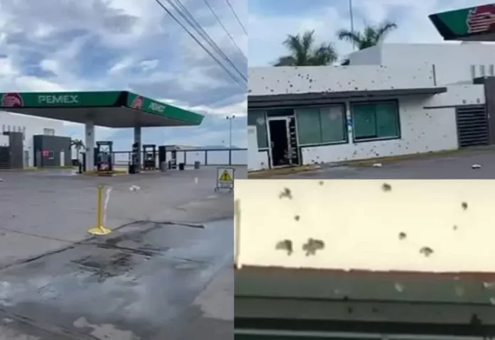 La estación de servicio presentaba múltiples impactos de bala en la fachada y se observaban algunos extintores junto a las bombas de abastecimiento, los cuales pudieron haber sido empleados por los trabajadores.
