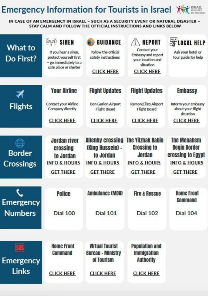 El Ministerio de Turismo de Israel ha puesto a disposición de los turistas que actualmente se encuentran en el país un sistema de registro para apoyar su salida del país, incluyendo posible transporte hacia el cruce fronterizo de Taba (Egipto) a partir de mañana 4 de marzo.