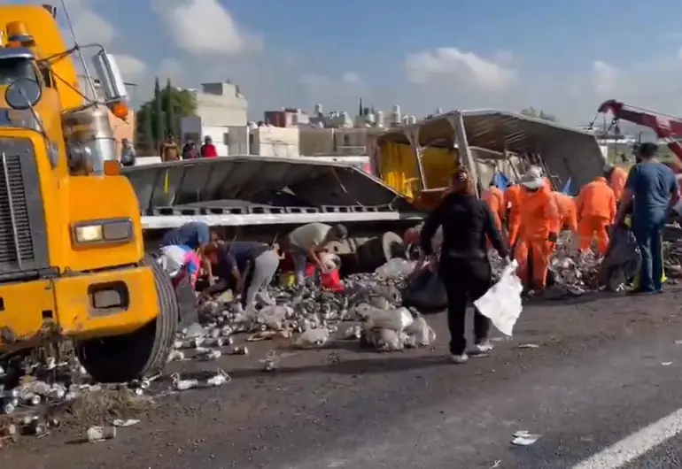 Tráiler cargado con cervezas vuelca y se desata la rapiña en la México Pirámides