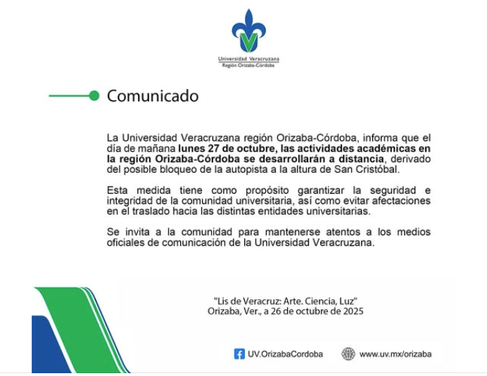 La Universidad Veracruzana, región Orizaba-Córdoba, informa que este lunes 27 de octubre, las actividades académicas en la región Orizaba-Córdoba se desarrollarán a distancia, derivado del posible bloqueo de la autopista a la altura de San Cristóbal.
