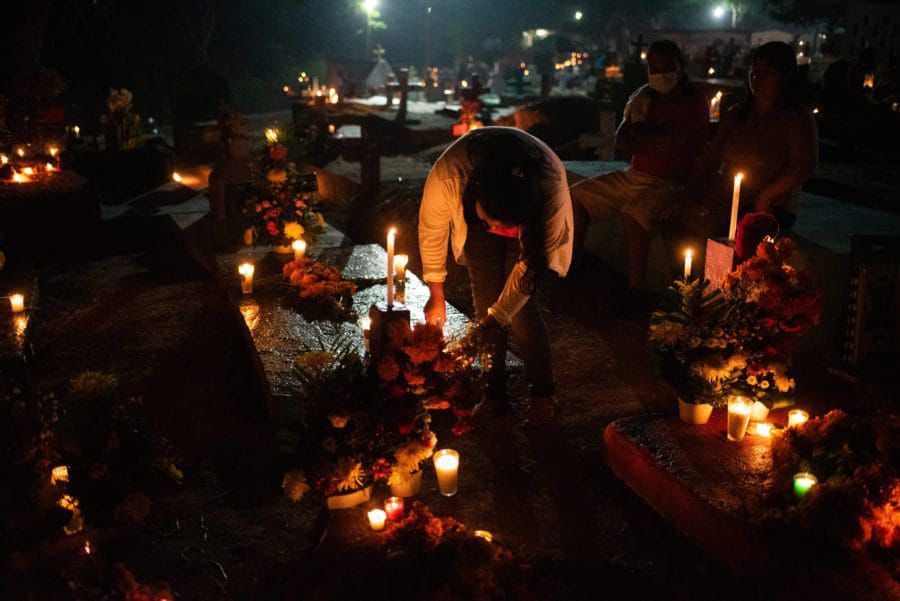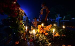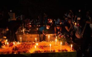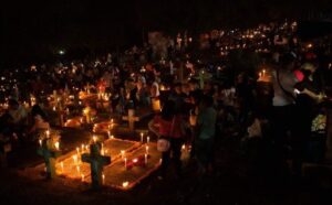 En el panteón municipal, la tradición cobra vida durante la noche. Velas y veladoras iluminan las tumbas, creando un ambiente mágico y lleno de recogimiento. Familias enteras se reúnen para limpiar y adornar los espacios, mientras la música de bandas locales, mariachis y danzas tradicionales acompañan la vigilia, transformando el cementerio en un espacio de luz, memoria y convivencia.